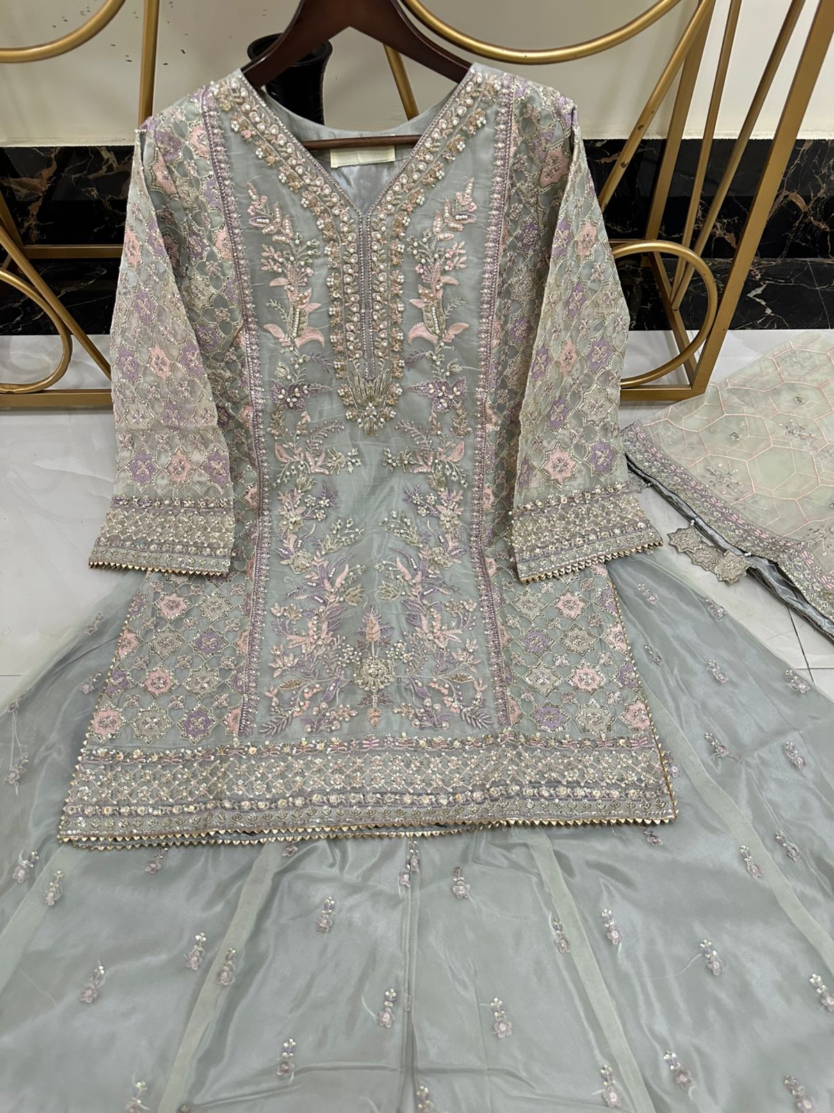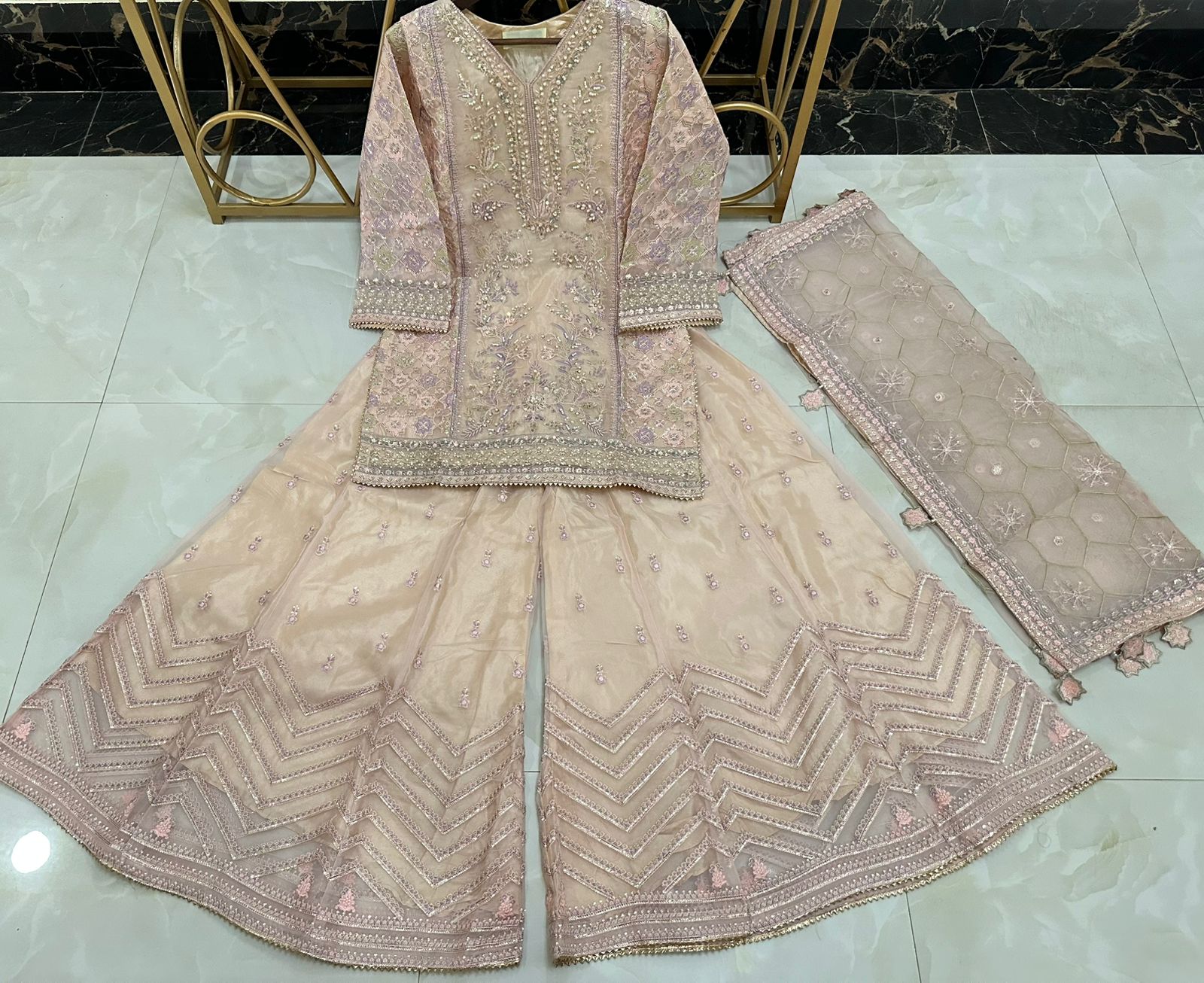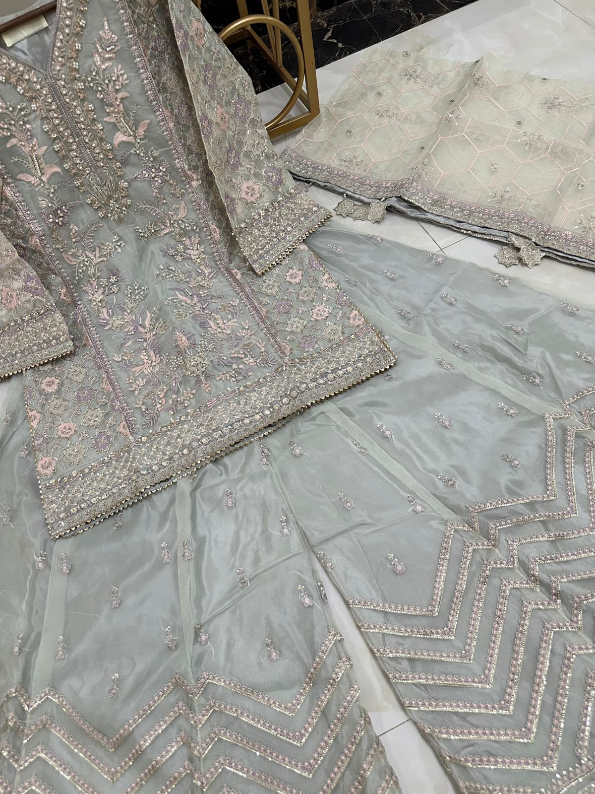 Newly Arrived Beautiful Pure Organza Handwork Heavy Shirt With Front Back Same Work Sharara Along With Beautiful Embroidered Dupatta With Hanging Tussels…!!!