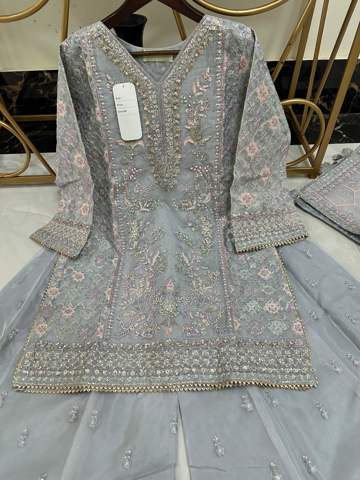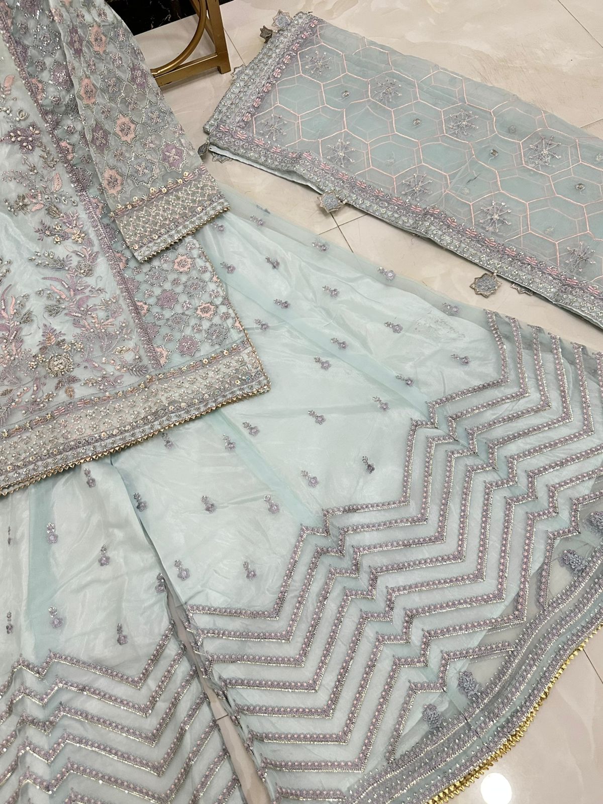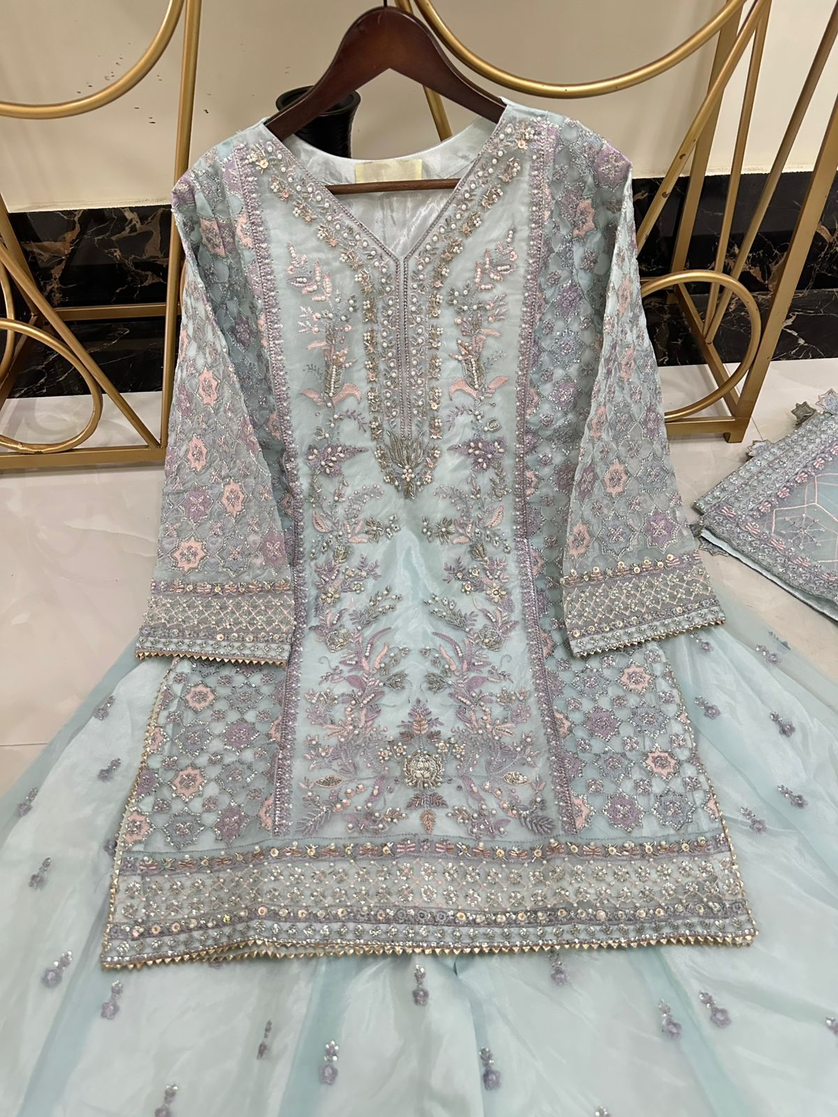 Newly Arrived Beautiful Pure Organza Handwork Heavy Shirt With Front Back Same Work Sharara Along With Beautiful Embroidered Dupatta With Hanging Tussels…!!!